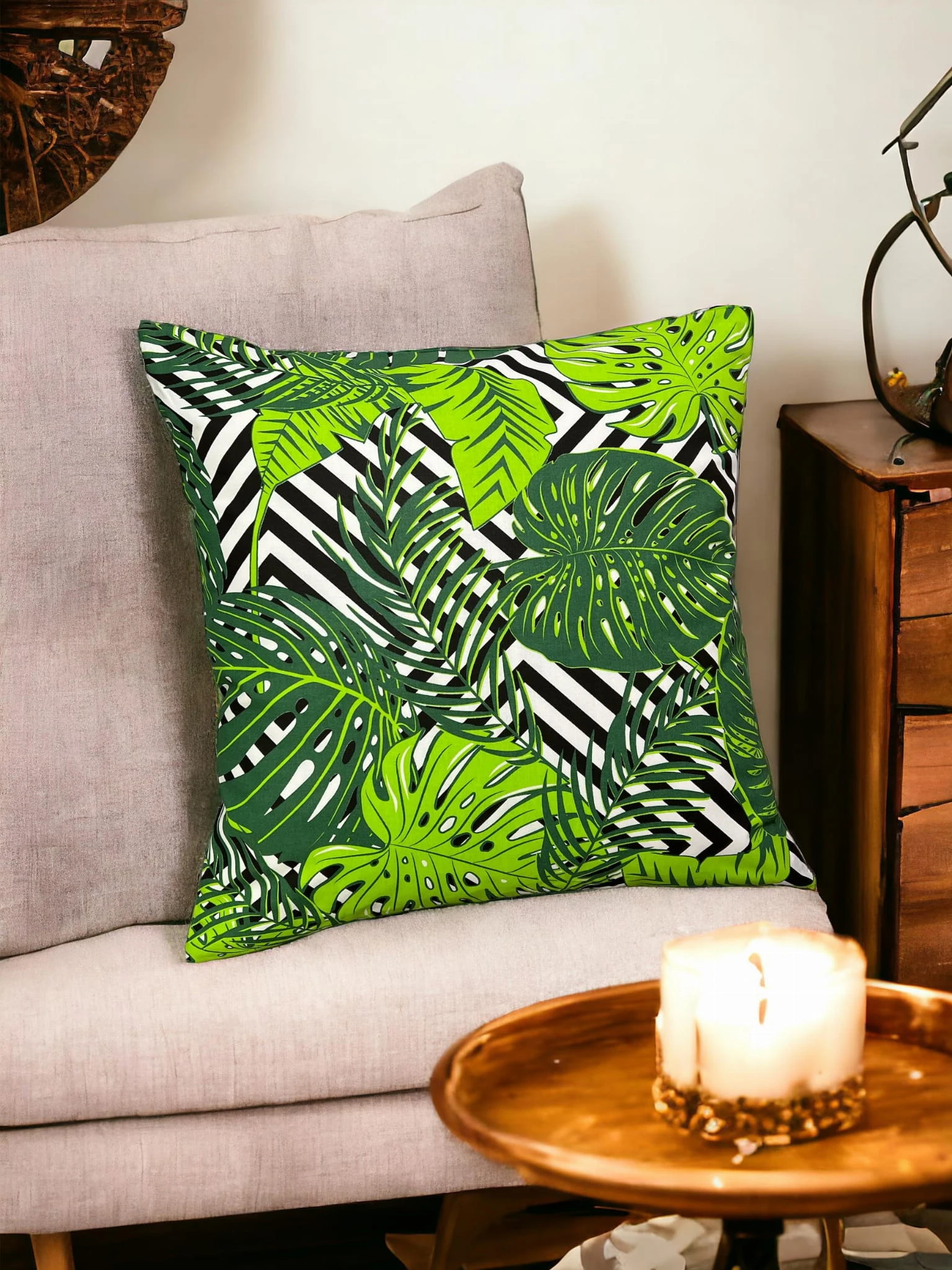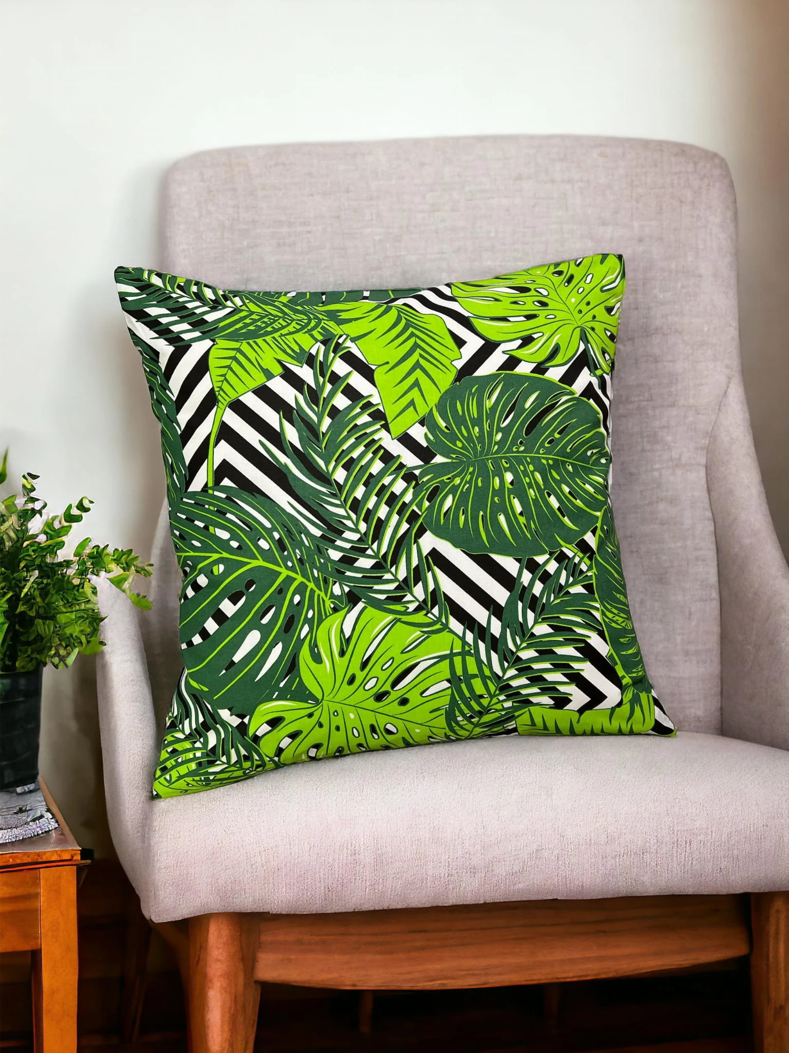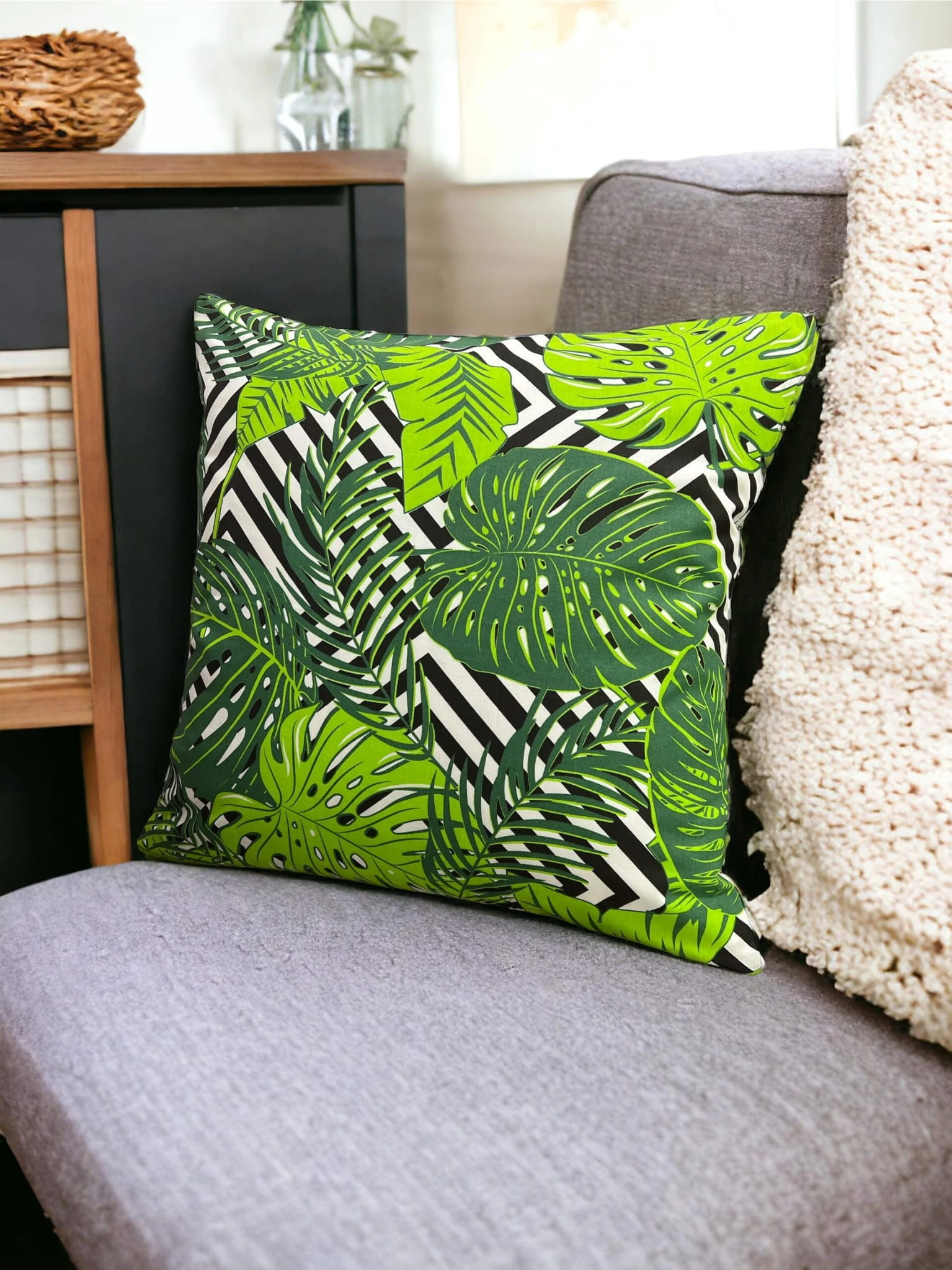 Bawełniana poszewka z dynamicznym motywem tropikalnym na czarno-białym tle. Wykonana z wysokiej jakości materiału, zapewnia wygodę użytkowania oraz łatwość w pielęgnacji. Idealna do salonu, sypialni czy pokoju dziennego, dodając wnętrzu nowoczesny i egzotyczny charakter.